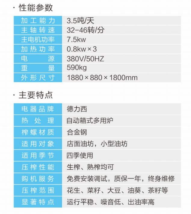 ★壓榨范圍:花生、大豆、菜籽、油葵、茶籽、芝麻等;★適用對象:店面油坊和微小油坊;★壓榨性能:熱榨一次榨盡,免費安裝調(diào)試